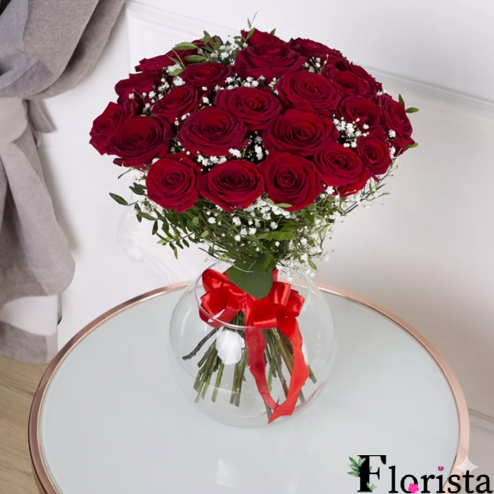 Опис до Червоні троянди з гіпсофілою - троянди преміум класу